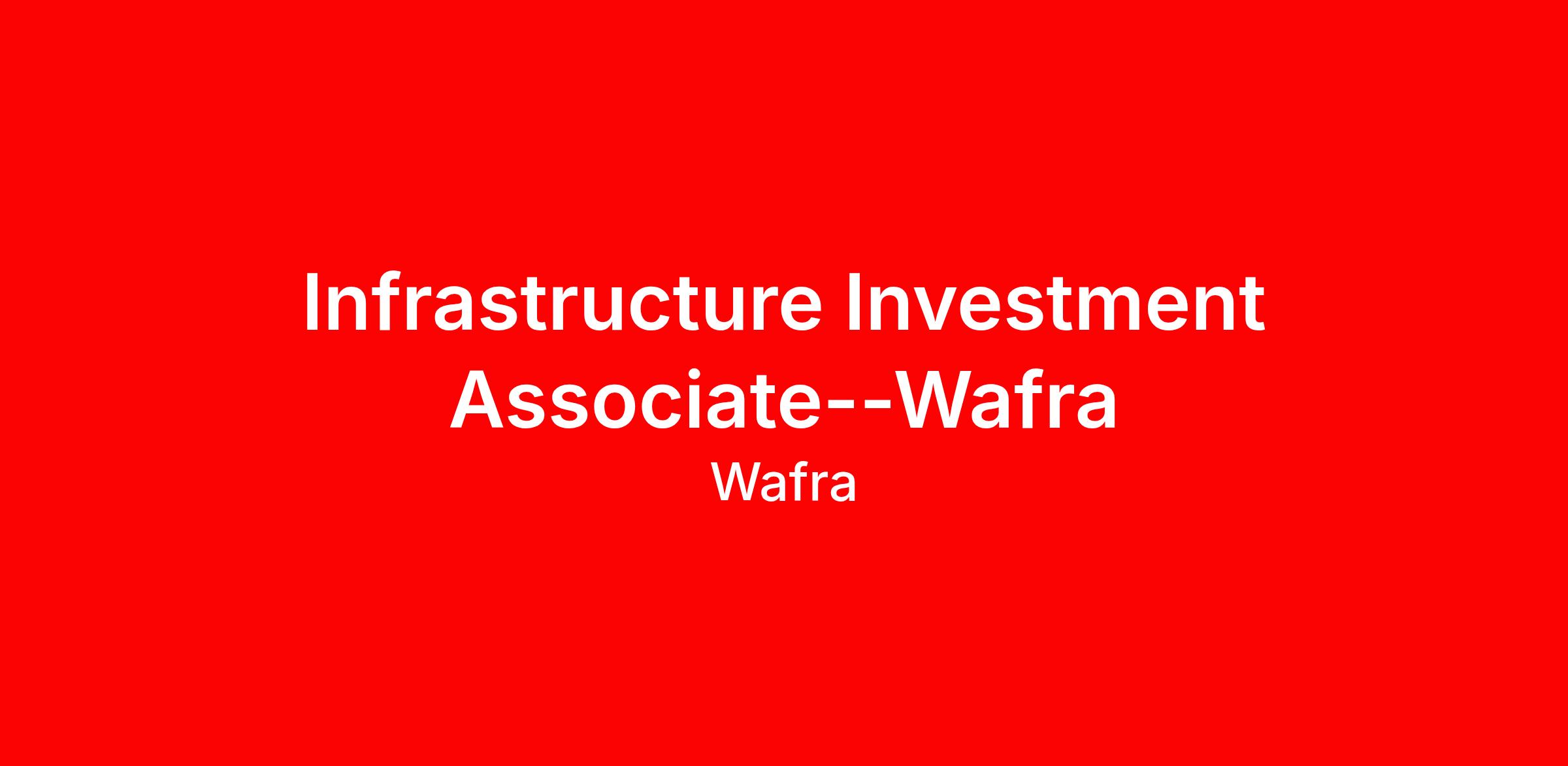 Position Summary: Wafra is a New York City–based global investment firm with approximately $29 billion in assets under management. Wafra is seeking an Associate to join its Real Assets & Infrastructure team. The role will involve evaluating, executing, and managing control equity and structured capital investments across a broad range of sectors, including transportation, digital infrastructure, power & utilities, and other infrastructure‑related asset classes. The Associate will work closely with senior investment professionals across the platform and play a meaningful role throughout the investment lifecycle.